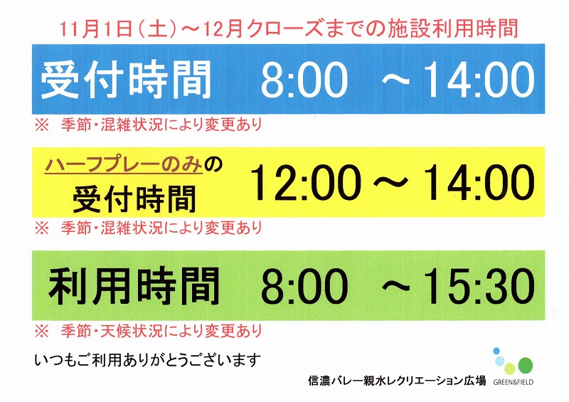 【11月1日(土)~12月クローズ迄】の受付・利用時間は下記の様に変更
